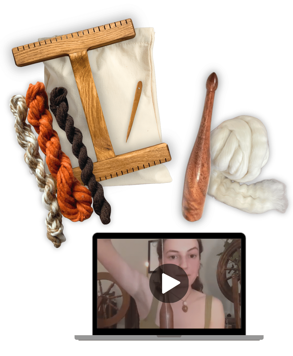 If you’re joining our course and are new to the arts of spinning and weaving, you can choose your own path: either craft your tools using simple materials from around your home (a sturdy piece of cardboard becomes your loom, and a smooth stick can be transformed into a spindle), or purchase professionally crafted tools.